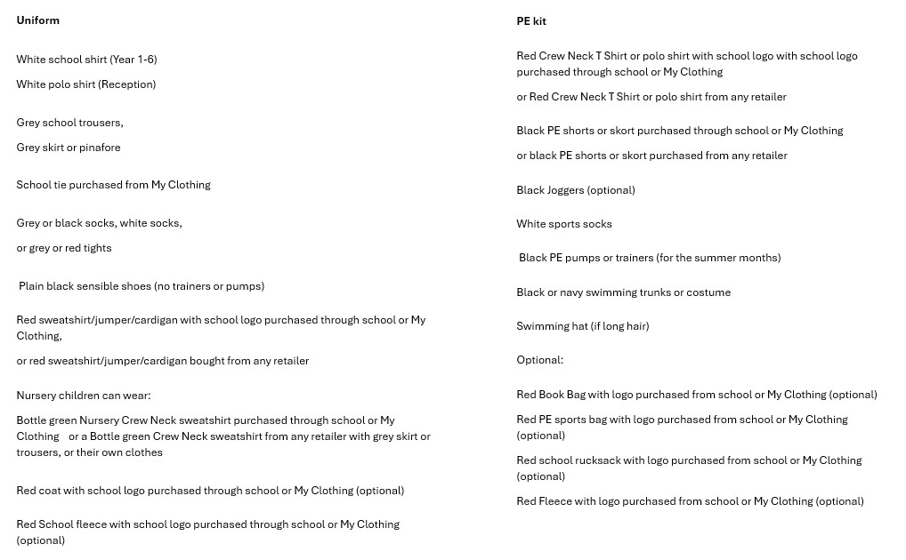 Below you will find a list of all the uniform your child will require during their time at Brockhampton. Our branded school uniform can be purchased for both the main school and Nursery via My Clothing. Please see the 2 links below to go directly through to the correct website pages: